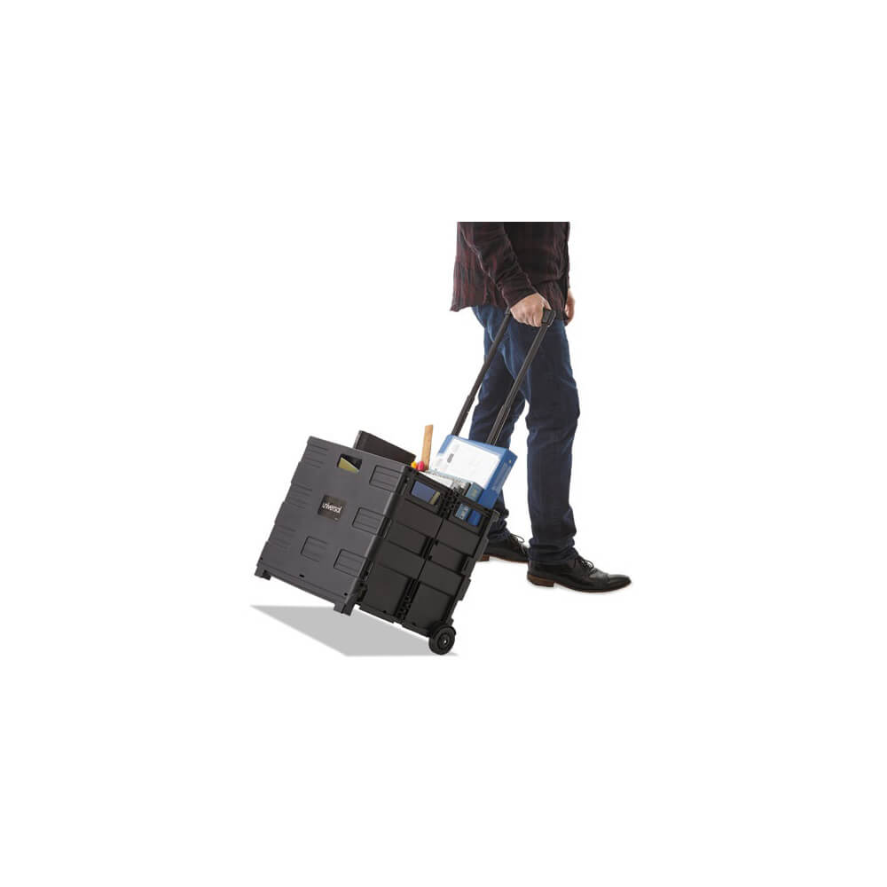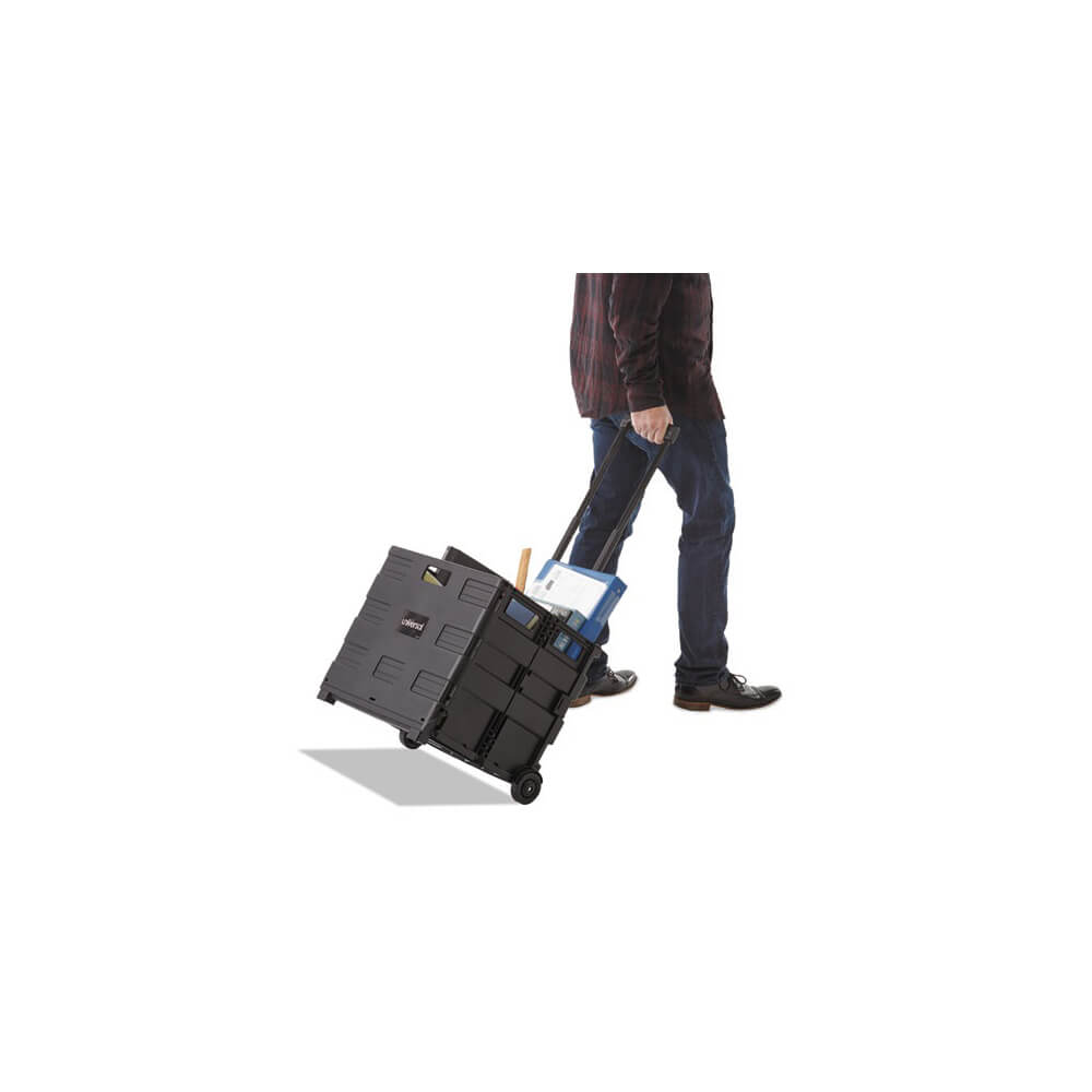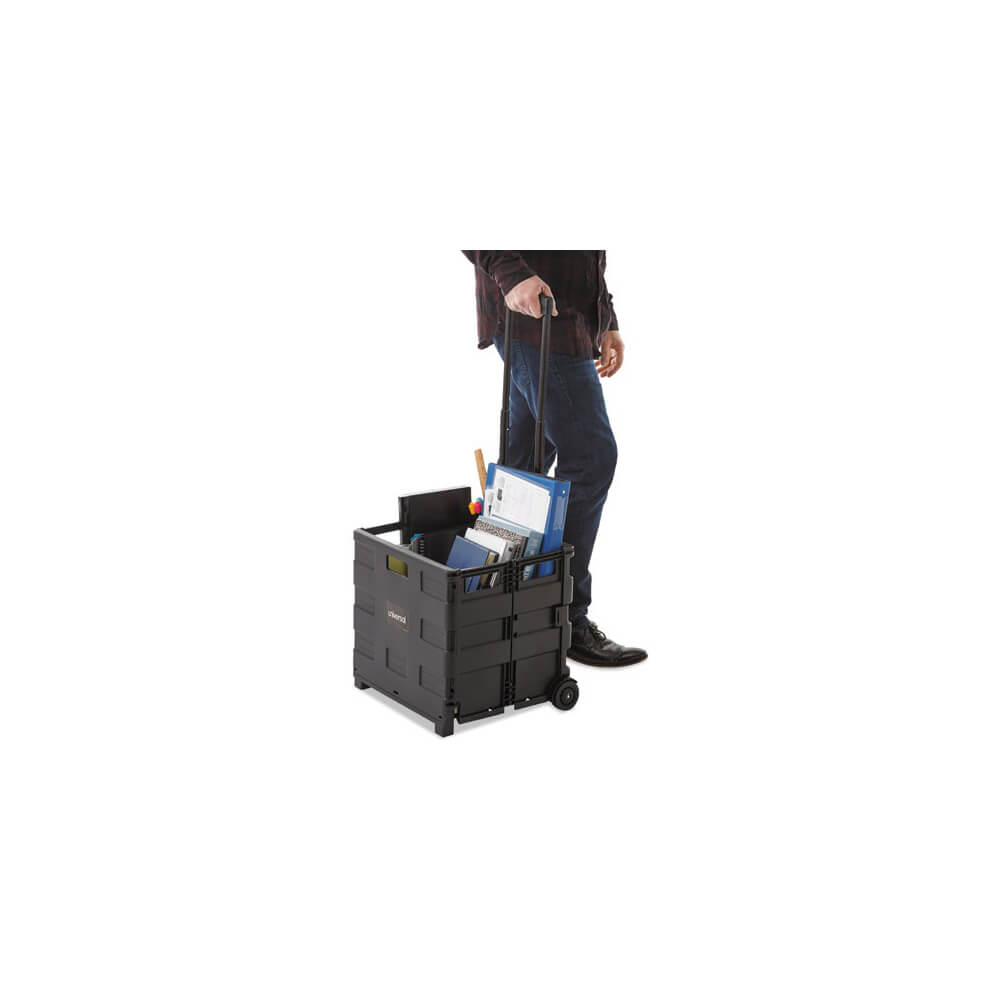 Ideal for transporting bulky items with ease in just one trip. High capacity (1.7 cu. ft.) rolling crate with built-in telescoping handle. Collapses flat to 3-1/2″ for easy storage; opens in seconds. Includes support rails for additional durability and carrying grips on all sides for lifting. Lightweight, extremely durable plastic frame. Two non-marring wheels. Supports up to 60 lbs.