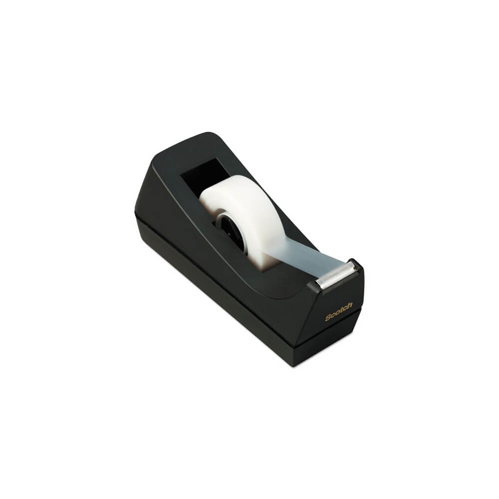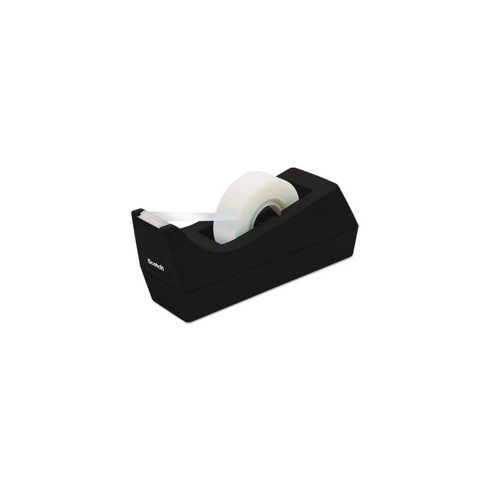 This black, economical tape dispenser allows for one-handed dispensing of a wide variety of tapes. It holds standard, 1″ core tapes and can hold tape up to 3/4″ wide by 1500″ long. The weighted base allows for one-handed dispensing. This dispenser is an economical, reliable, classic style desktop office tape dispenser.