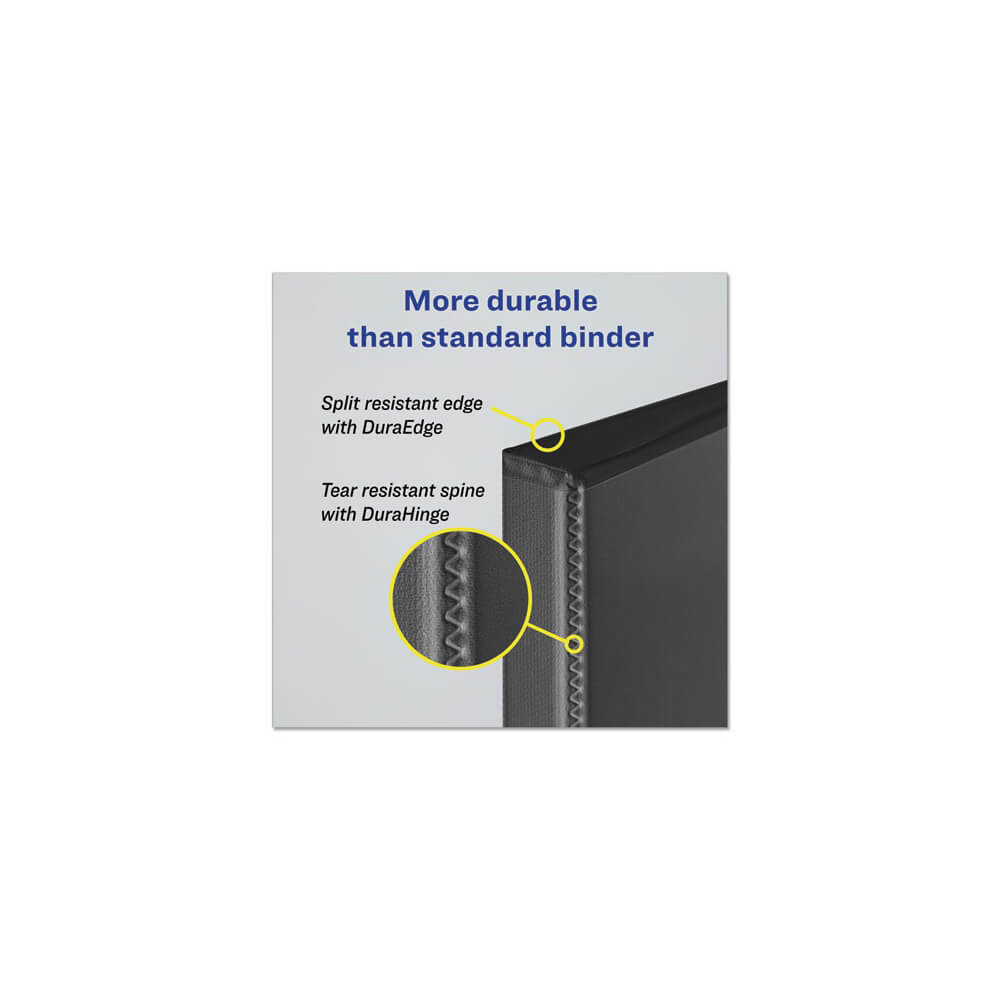 • Binder features a DuraHinge® design that's stronger, lasts longer and resists tearing, and DuraEdge® that makes the sides and top more pliable to resist splitting.