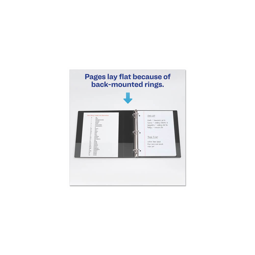 • Wide front and back binder panels fully cover standard dividers and sheet protectors.