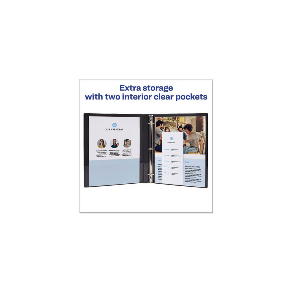 • Wider front and back panels fully cover standard dividers and sheet protectors.