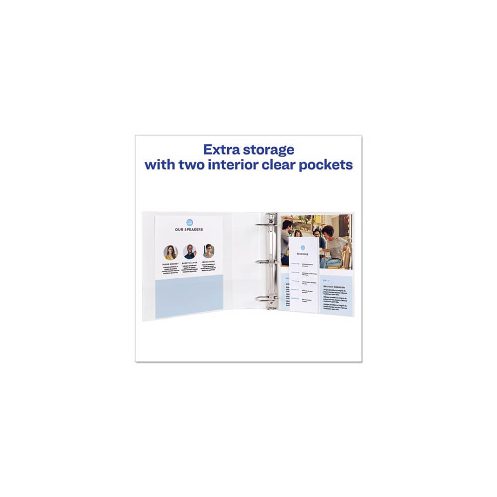 Perfect for light-use, this slim binder is a convenient and lightweight solution. Textured clear cover hides surface damage resulting from normal use. Put your personal stamp on the binder by designing a customized cover from Avery® Design & Print. Tuck important handouts, pamphlets and other loose or unpunched paperwork into the two interior pockets for quick access. Rings are either back-mounted for a clean spine and pages lie flat, or spine-mounted with concealed rivets – perfect for customizing front and back layers. It’s the friend your papers never knew they were missing.