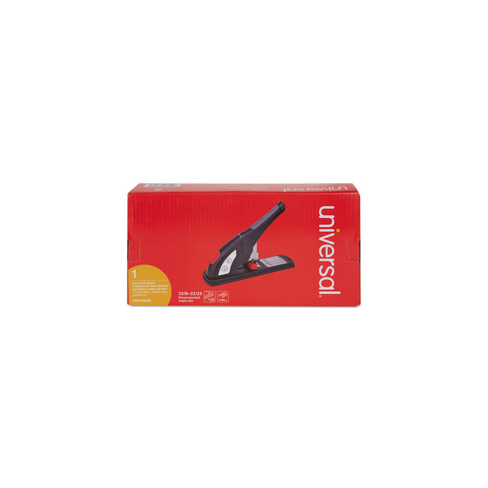 Powerhouse stapler drives through up to 200 sheets with a single heavy-duty staple. Features include an extended throat depth, an adjustable paper stopper and easy, front access staple re-loading. Nonskid base and grip handle ensure stable, comfortable operation. Plastic and metal construction.