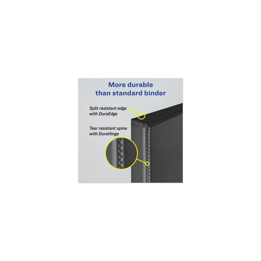 • Binder features a DuraHinge® design that's stronger, lasts longer and resists tearing, and DuraEdge® that makes the sides and top more pliable to resist splitting.