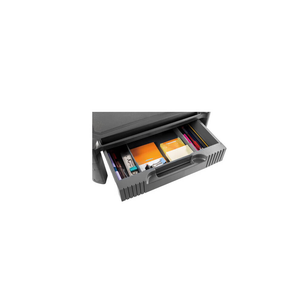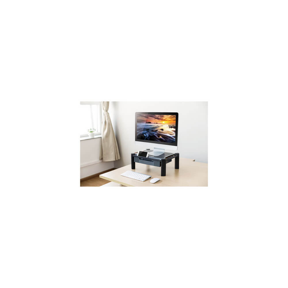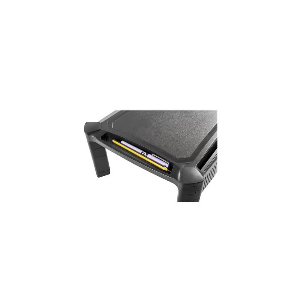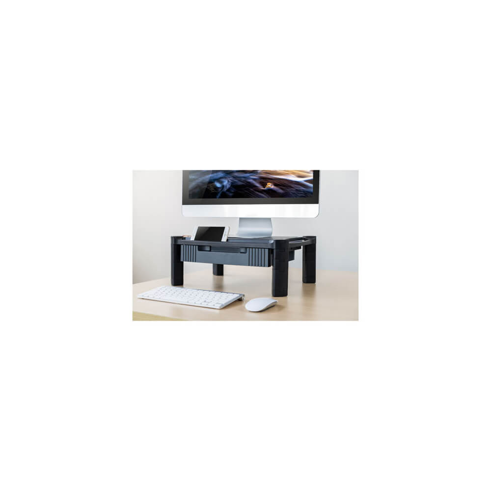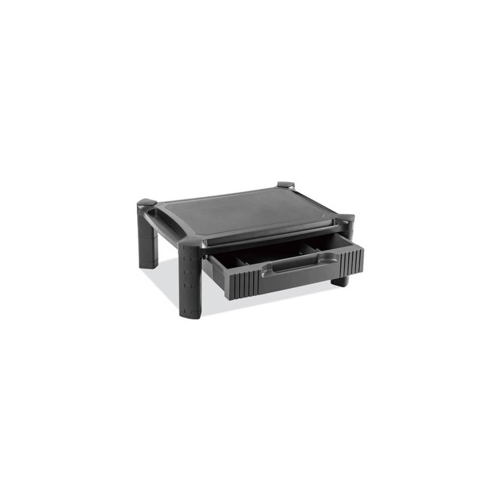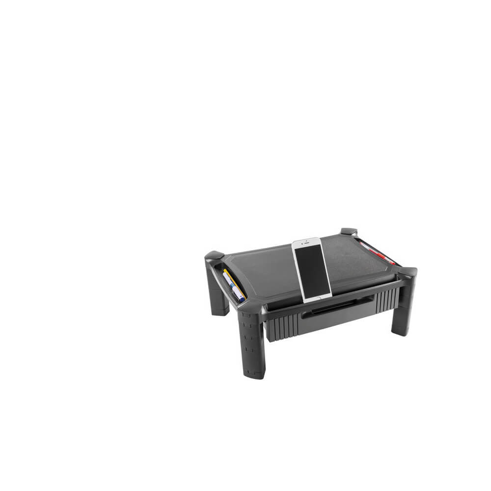 Set your monitor at an ergonomically correct height and maximize desk space with our height-adjustable smart stand. This stand features a contemporary design with stacking columns, letting you choose the ideal height for your monitor. With ample clearance between the stacking columns, this stand provides plenty of room to fit a small laptop or supplies beneath. A non-skid column base and 22 lb. of each shelf support help to ensure your monitor or other electronic devices rest securely while you work. Built-in cable organizer and drawer maximize desktop space and minimize clutter. Accommodates most 13″-32″ monitors, laptop, printers, and other office machines.