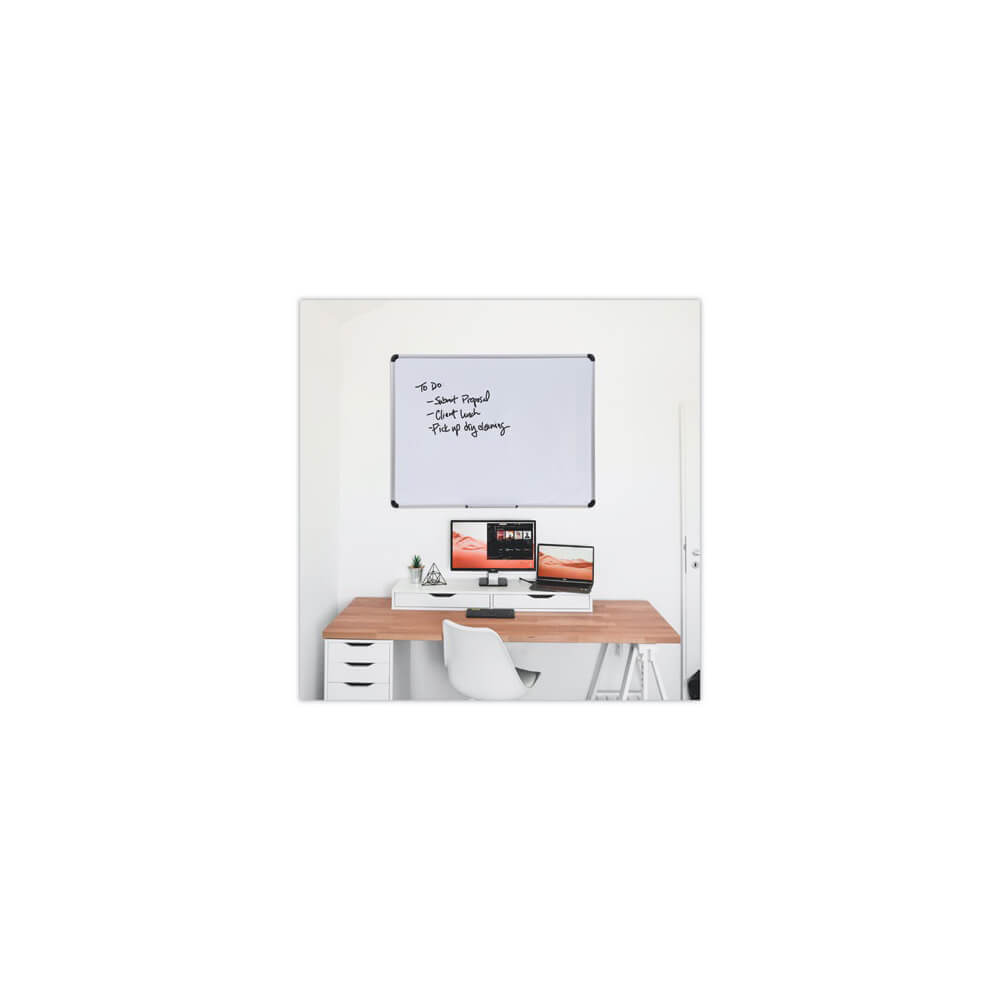 Stylish and functional dry erase board that also doubles as magnetic bulletin board. Built with a magnetic lacquered-steel surface that is suitable for frequent use and is compatible with all dry-erase markers. Modern, contoured aluminum frame features attractive, protective, black, rounded, plastic corners. Four-corner system enables vertical and horizontal mounting with included hardware. Dry erase markers and eraser sold separately.