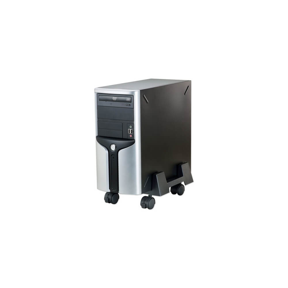 Nonskid padding holds CPU in place. Durable construction ensures strength and stability. Wheels enable easy mobility.