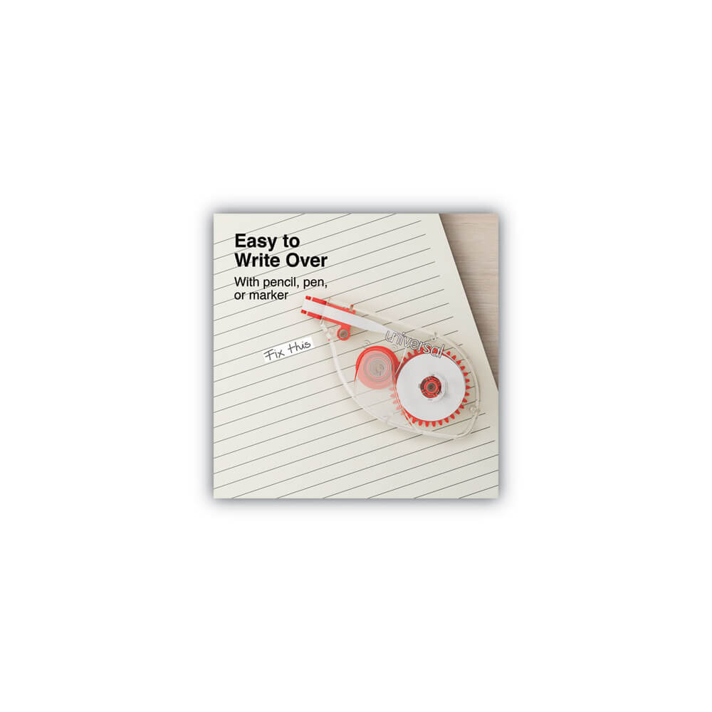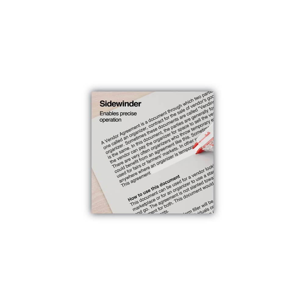 Easy corrections made even easier. This side-apply variant of a tried and true design features improved ergonomics and a use-style that just feels more natural. Handling both single- and multiple-line corrections, the tear-resistant, film-based tape completely covers print or pen marks in one pass, ensuring uniform results. A flexible head accommodates your preferred application pressure. Transparent casing allows you to keep an eye on your remaining supply levels. Non-refillable.