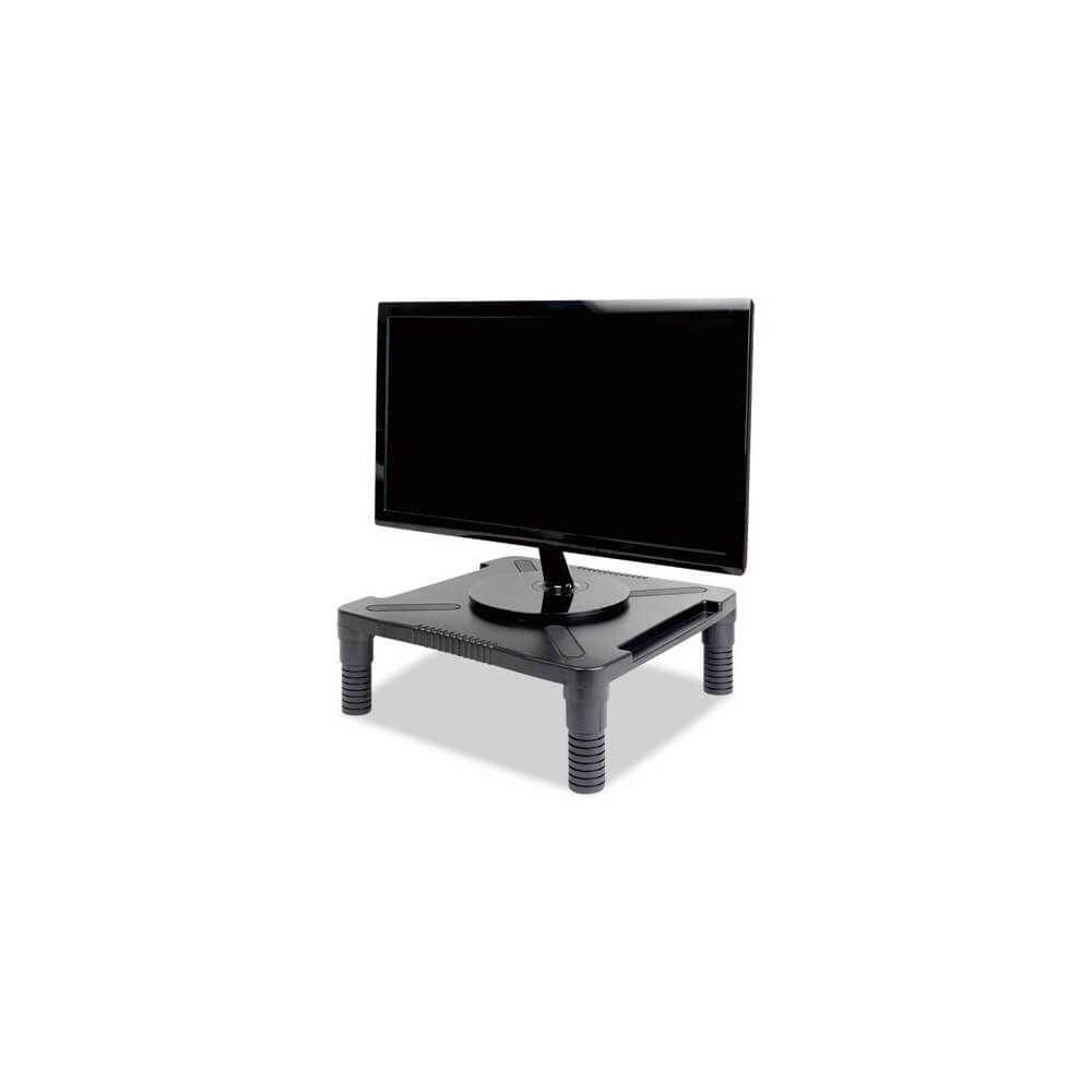 Elevates monitor to provide a more comfortable viewing level. Cable manager in the back keep cords tangle-free. Constructed from strong durable plastic. Non-skid rubber feet protects surface. Fits most flat panel monitors up to 24”.